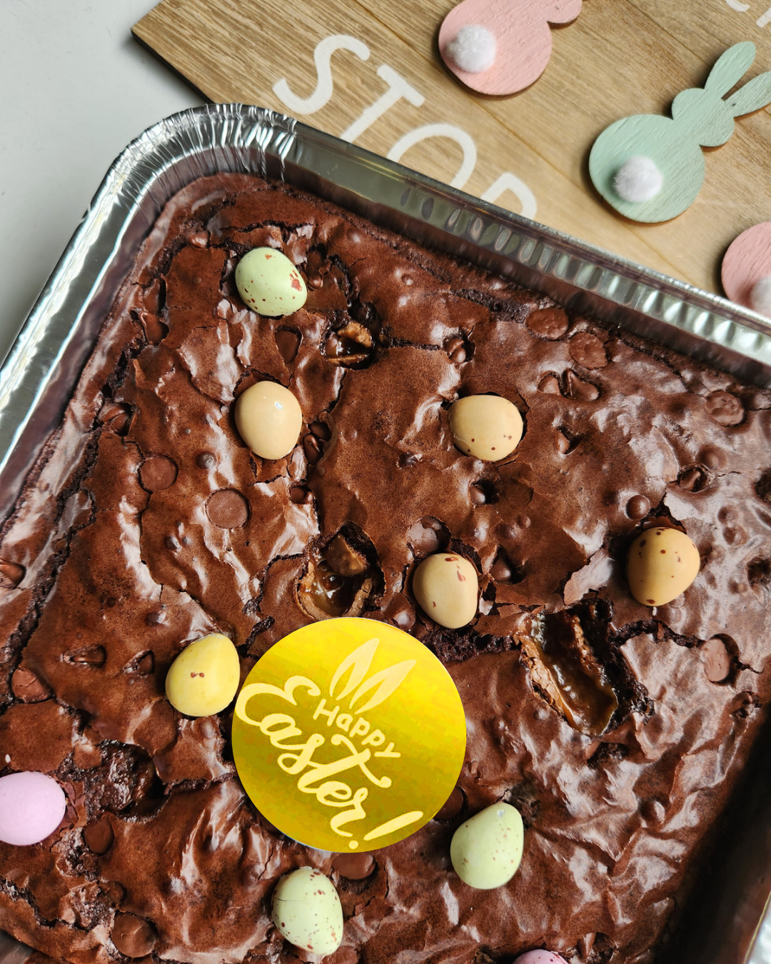 This small decadent triple choc brownie slab generously feeds 8-12. It is topped with speckled eggs and adorned with a Happy Easter acrylic disc*.